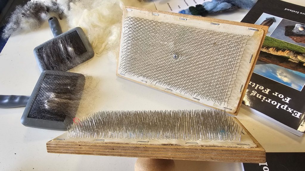 The first example were spiked carders. It was make and do. the small plastic black brushes were simply dog brushes. The steel spikes were picked up by our own Lorna, in Morrocco, and repurposed to suit the activity. These items take any remaining impurities out of washed wool.