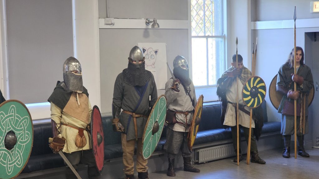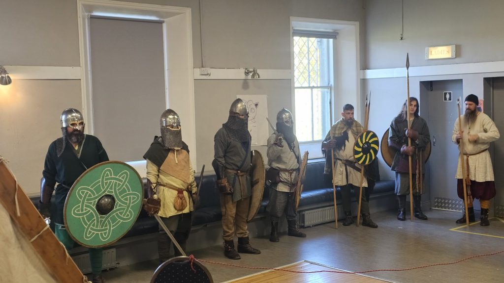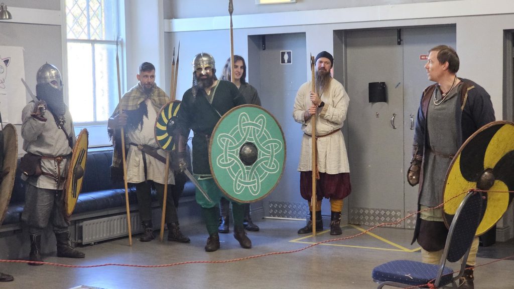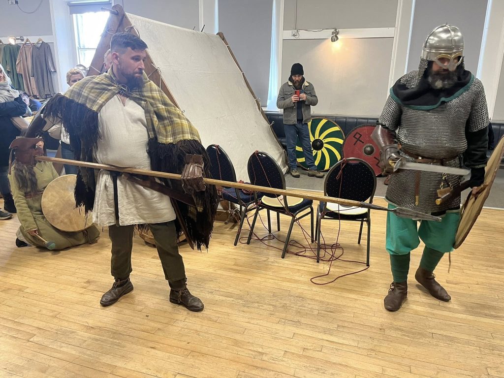 The Vikings recruited new warriors in CIE Hall, not by age but by talent. Enter the master of ceremonies, bringing the kids into shield wall formation to test their newly made defensive shields, aided by an Irish warriors long spear and cold viking steel.